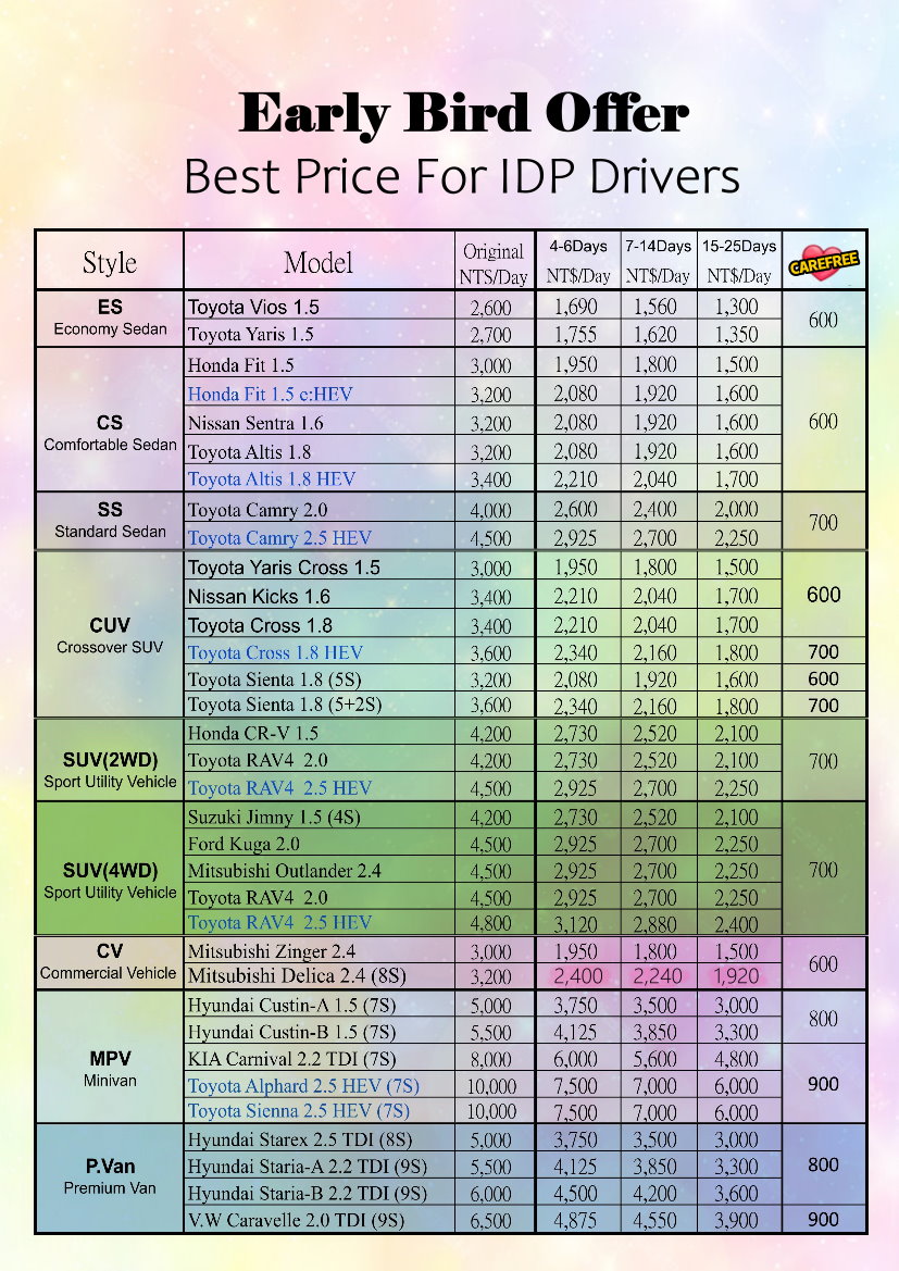 To qualify for discount, please provide a valid passport and International Driving Permit (IDP).
